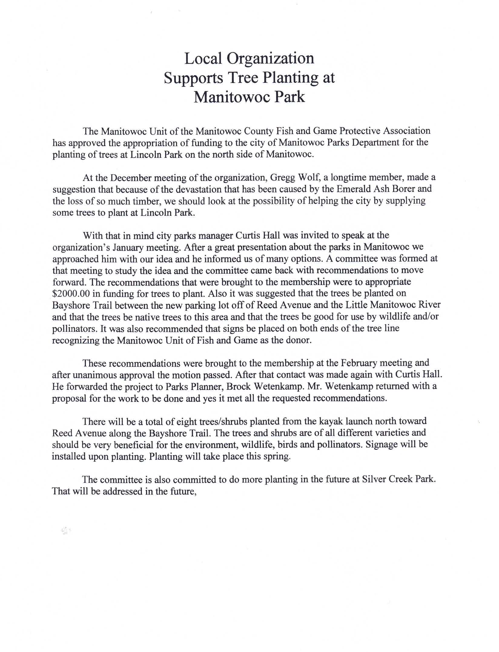 The Manitowoc UNIT of the Manitowoc County Fish & Game Prot. Assn. presented a check to the City of Manitowoc Parks Dept. for the planting of trees at Lincoln Park near the kayak launch.