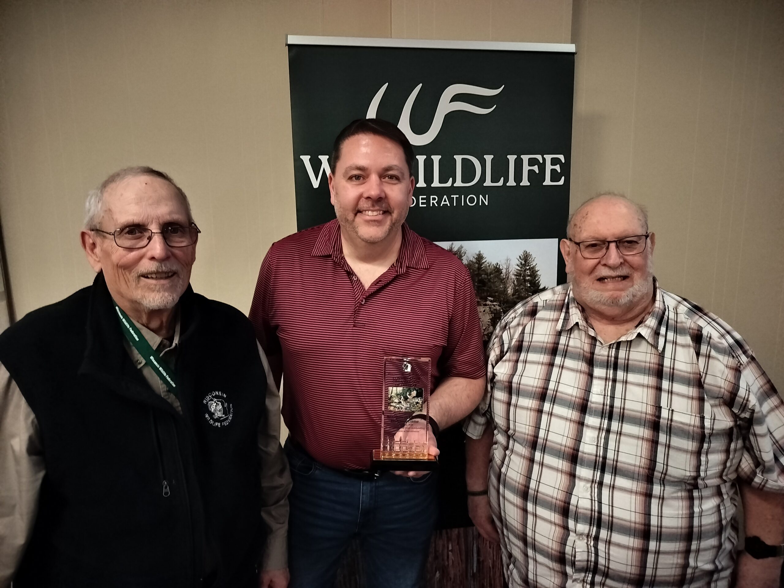 Terri Roehrig, President of WiWF,  Dan Dufek, President of MCFGPA receives the award from Cody Kamrowski, Executive Director of WiWF