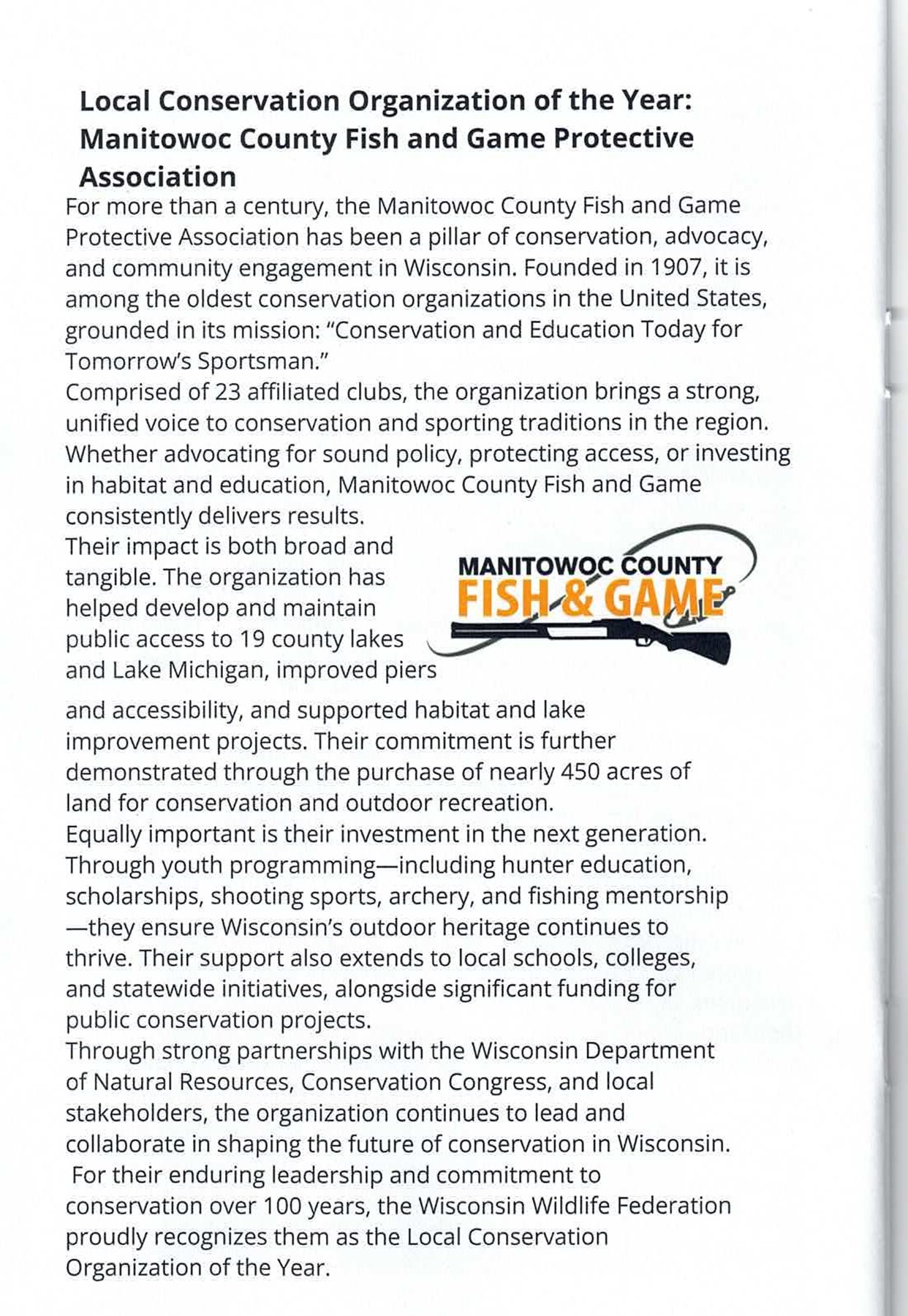 Local Conservation Organization of the Year: Manitowoc County Fish & Game Protective Association