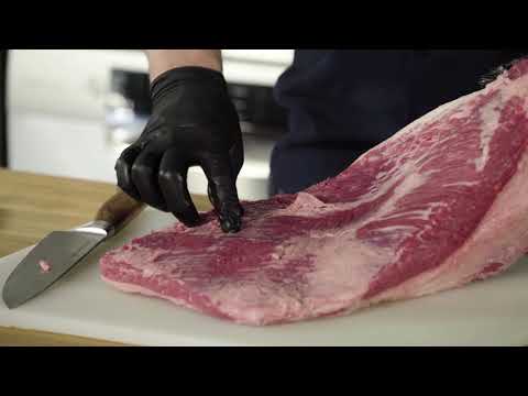 Trim any hard fat from all sides of the brisket, being careful not to dig too deep into the meat. Trim the sides of any excess or loose fat. Trim the fat side of the brisket to 1/4″ thick.