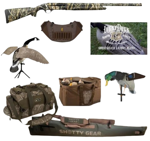 Grand Prize: Retay Gordion 20ga Max 7 Camo Shotgun, Lucky Duck Goose Layout Blind, Lucky Duck Goose Flapper, Lucky HD Mallard, Drake Blind Bag, Drake Decoy Bag, Shotty Gear Gun Case, Browning Shell Holder Hand Warmer, Alps Game Stramp, Call AND Ammo! |